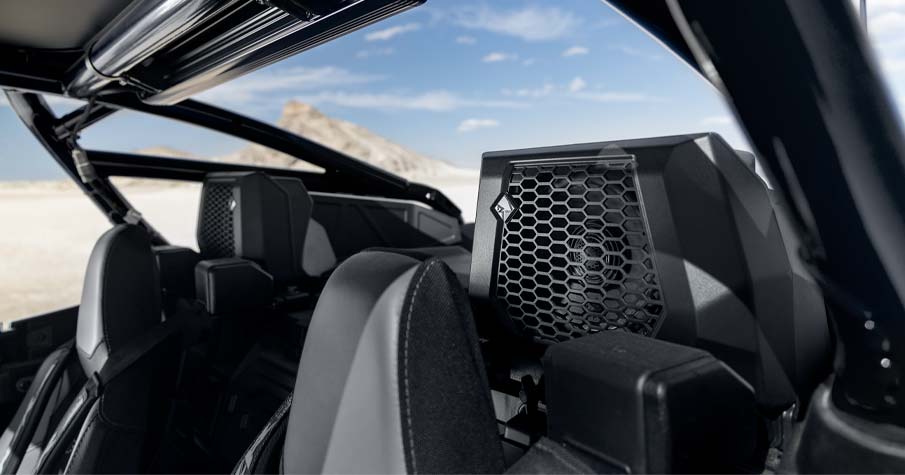Sistema de audio Rockford Fosgate Stage 4 afinado e integrado de fábrica con unidad fuente RIDE COMMAND. Incluye: (1) amplificador digital de 8 canales de 1500 W, (2) tweeters de 1" de 100 W, (2) bocinas frontales componentes de 6.5" y 100 W, (2) bocinas traseros coaxiales de 6.5" y 100 W, y (1) subwoofer de 10". El sistema de audio ha sido probado con inmersión en agua IPX7 e IPX9K para resistir los elementos húmedos.
